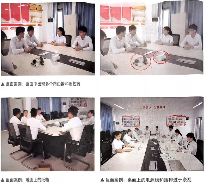 【对比举例】墙上字画的位置、桌面上物品的选择和摆放都会影响画面的整洁度,拍摄者都需要考虑周到。此外,桌上或墙角有凌乱缠绕在一起的电线、空间中出现过多的线条或色彩、室内外有强光干扰,以及与拍摄场景不相关的物体出现在显眼位置,都有可能导致画面显得杂乱不清。相反,收纳整齐的线路会使画面显得清爽、有序,在视觉上增强整体的整洁效果。在这种情况下,观众能够专注于主体内容,而不被杂乱的线路分散注意力。