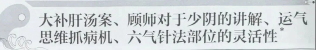 处方:川桂枝10g 炮姜炭10g北五味15g陈旋覆花10g(包)淡竹叶10g 大枣20g 怀山药30g粉丹皮6g炒当归10g处方思路:该患者长期崩漏,治疗效果不稳定,属于疑难病例,此次顾老师从丁年木不及的角度,用大补肝汤,木气不及,肝血下流也可以导致崩漏。大补肝汤:出自《辅行诀》,原方为桂枝、干姜、五味子各三两,旋覆花、代赭石(或为粉丹皮)、竹叶各一两、大枣十二枚(或为薯蓣),共七味。治肝气虚,其人恐惧不安,气自少腹上冲咽,呃声不止,头目苦眩,不能坐起,汗出心悸,干呕不能食,脉弱而结者。从方名可以看出此方为肝虚而设,网上探讨此方多从方证角度及五行肝木入手,从开阖枢角度来看,此方似乎可以归入厥阴,一者厥阴在东方升中有降,此方桂枝为升,五味子、旋覆花、代赭石均为降,符合厥阴主阖之意,二者虚则厥阴,气上冲头眩也为风象。另小补肝汤:桂枝、干姜、五味子各三两,大枣12枚,主治“心中恐疑,时多恶梦,气上冲心,或汗出,头目眩晕者”。本月在跟随顾老师门诊时老师提到了少阴君火的问题。少阴君火从本从标,不能用火来简单理解少阴的含义。很多人认为今年是燥热年,但从上半年的实际气候情况来看,这种看法并不准确。顾老师还谈到了少阴君火与少阳相火的含义,少阴君火在开阖枢图中位于正北方,但是不能把君火认定就只与北方相关联,开阖枢是动态的圆运动,所以六步主气中少阴君火位于二之气(在六步主气形成的圆周期图中,少阴君火并不位于北方,而位于东南方),正值阳历3月底至5月底,那时天气由寒转暖,故老师提到少阴君火一般不予苦寒清热法,少阴君火需要养,而少阳相火位于东南方,时令处于夏季,是茂盛之火,可以用苦寒法。老师在本月前些时候提到了在六气针法中少阴的针法,普通用法是随着左升右降的顺序针刺圆的切迹,而在要降少阴火时可以广明透太冲,同时提到太阳不仅仅可以针刺东北位,同时可以按照欲解时的方位针刺(东)南位。顾老师在江阴沙龙上讲话:江阴青阳倪君院长的第1个患者(倪君院长分享了他从阳明论治胃痛的案例)胃痛,胃本身就是阳明,从阳明论治没有问题。胡淑占的病例比较好地体现了运气思维,运气思维并不是围绕病症病象,而是抓病机。黄连茯苓汤抓病机的要点在于寒盛火郁,而不是对各个症状的量化评估,抓住要害后可暂不考虑伴随症状,我们日常生活中有很多古代的文字传承,都是在长时间的生活中总结出很精辟的话,有成语“当机立断”“随机应变”都是“机”,都是在提示要抓“机”,同时又有“时机”,提示“机”与时间的关联性,欲解时就是这个问题,“机巧”又是将“机”与“巧”联系在一起,说明机是需要灵活对待的。2008年,一位女性患者胃痛明显,多为后半夜1~2点发病,给予乌梅丸治疗,服药后疼痛明显减轻。就抓住发病的时间规律,对于胃痛的寒热虚实都不需要管。欲解时并没有去和病证对应,也无法去讨论欲解时和病证的对应,所以胡淑占治疗帕金森患者完全不需要管这个病。欲解时也最能反映中医治病不治病的特色,对于发病的时间点西医完全没有考虑过。所以史锁芳教授(临症时)比较关注(疾病发作的时间点)。今年用麦门冬汤效果好和今年的运气是有关系的,今年上半年的新冠重症我们首先推荐的就是麦门冬汤,治痿独取阳明,肺痿也是痿,痿证最重要的病机就是伏燥,所以需要取阳明。抓阳明、抓伏燥的病机是用麦门冬汤的主要点,从症状来抓只是一部分,还可以从乏力、从脏腑部位、从出生运气、从当令时间,我们需要从多角度来抓三阴三阳,来抓阳明。其中需要注意“时机”,注重从时间规律上来把握三阴三阳。降火不一定要用清火的药,缪希雍“宜降气不宜降火”。使用正阳汤可以考虑调整药物剂量,增加降气药的比例来实现清火的作用。近期有用丹皮或黄芩来代白薇的。汗为心液,从六经来讲就是少阴,今年的时段可以从少阴治,从少阴比从心来讲思路会更广。少阴从本从标,广明是少阴之本,太冲的位置是少阴的标。太阳也是从标从本,从六气针法来讲,太阳也不是光扎左后方,扎欲解时的部位也是可以的,太阳从子位开始,太阳本为寒,标是太阳走到了南方位,成数为九,所以标为阳,太阳和少阴扎广明的区别在于太阳的针法就是常规针法,扎广明的针法是人体矢状面方向进针。从广明位的火降到命门位就是少阴,午位火正化是少阴的本,子位为寒对化是它的标,所以正化对化和标本理论是一体的。范先靖按:顾老师再次提到了三阴三阳方位的问题,在不同的情况下三阴三阳的方位有所不同,方位与三阴三阳不是一一对应固定死的。