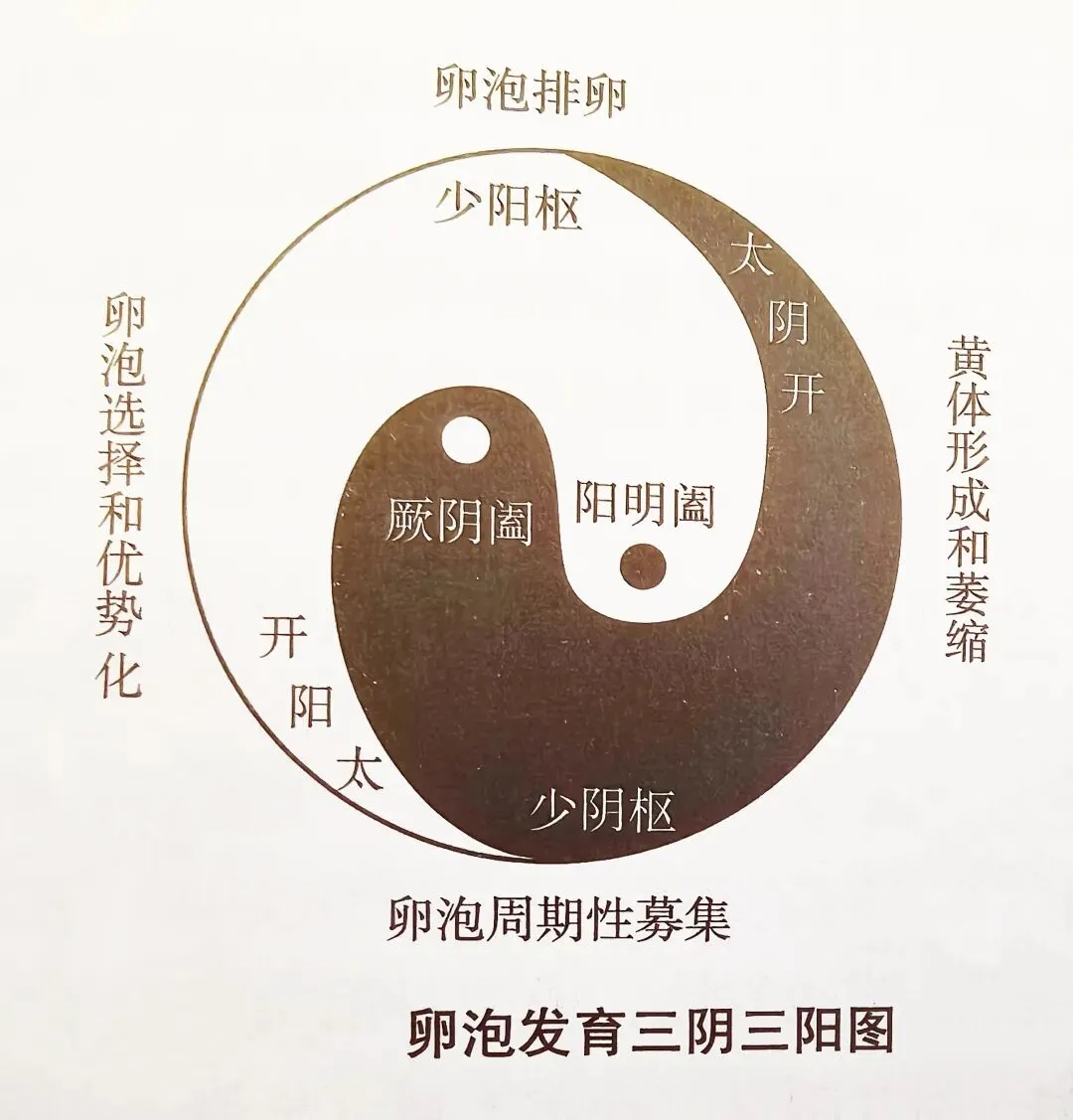 喻闽凤按:目前龙砂流派对于月经周期与三阴三阳开阖枢的认识如下:从开阖枢气化认识卵泡发育周期,卵泡的募集:上个周期的黄体期(月经前7天左右)及黄体-卵泡转化期,由阳明向少阴的转化;阳气为阖,潜藏阳气入少阴,化生精血内行下达。卵泡的选择和优势化:卵泡选择,月经周期的第5~10天,卵泡优势化,月经周期的第11~13天,由少阴出太阳经厥阴达少阳;少阴为枢,潜藏的精气转枢为卵泡生长的原动力,太阳为开,促进卵泡的选择,厥阴为阖,两阴交尽,最终一个卵泡选择出来,脱颖而出,随少阳生发,进入卵泡优势化,体现风从火化;卵泡排卵,月经周期第14天,氤氲期,阳气旺盛,少阳位,卵泡成熟,通过转枢排卵;黄体期,月经周期第15~28天,属太阴、阳明位,阴生阳消,阳气肃降过程,若有妊娠,太阴脾土厚德载物,精血化气温养受精卵,若无妊娠,太阴转阳明合降,阳气潜藏,阴血不固,产生月经,进入少阴,开启下个周期的转枢。