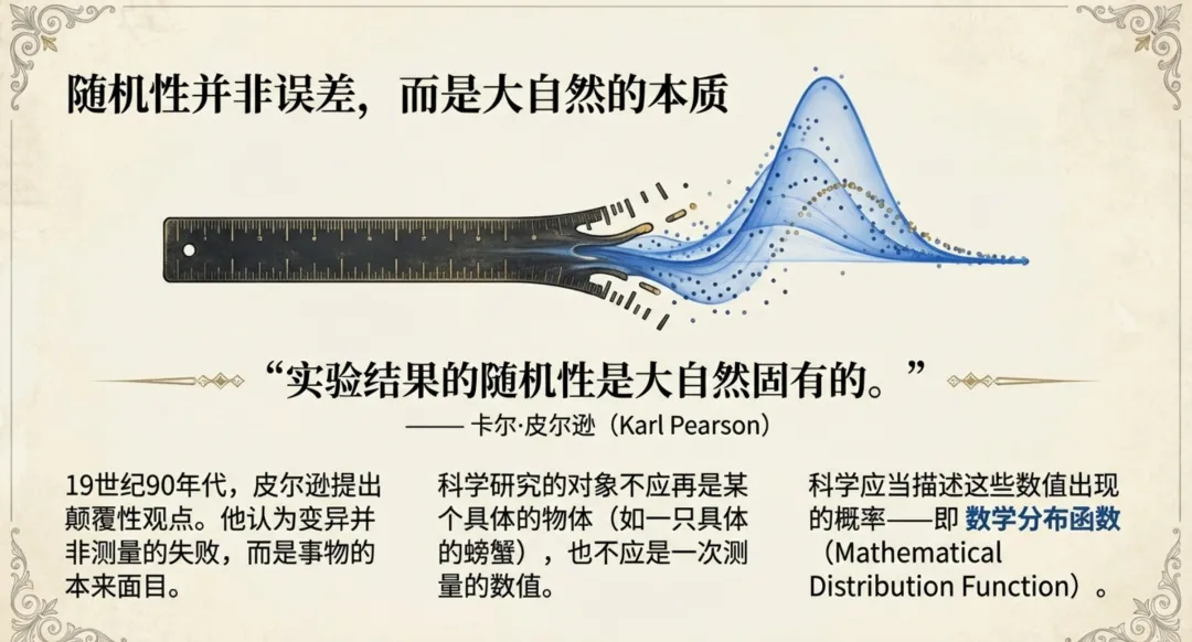 皮尔逊的突破:卡尔·皮尔逊(Karl Pearson)在19世纪90年代提出了一种革命性的观点。他认为,实验结果的随机性是大自然固有的,而非仅仅是测量误差。科学研究的对象不应是某个具体的物体或一次测量的数值,而是描述这些数值出现概率的数学分布函数。