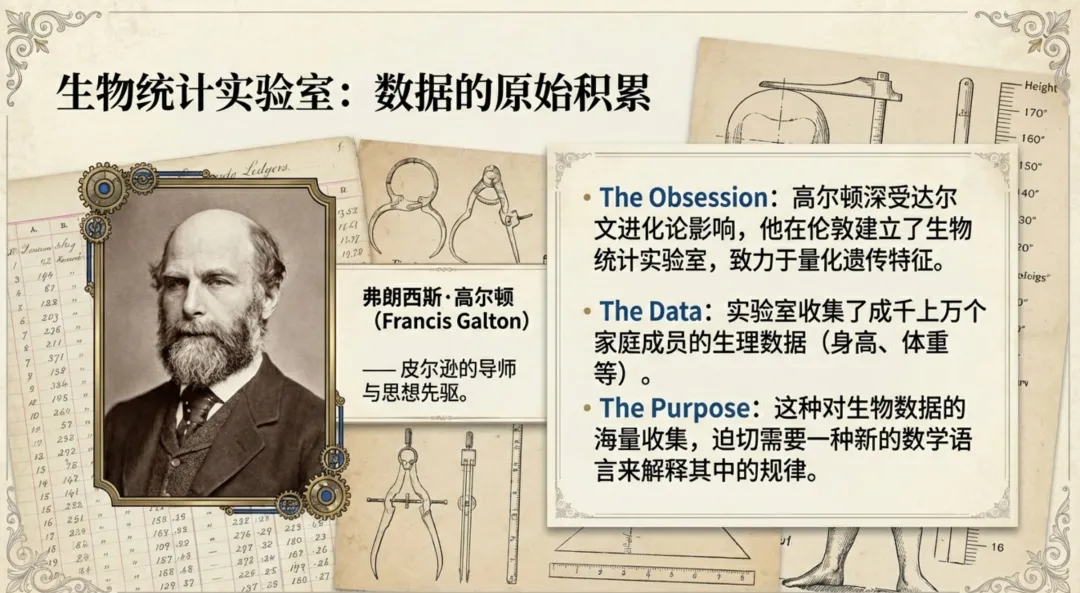《女士品茶》第二章的核心内容聚焦于**卡尔·皮尔逊(Karl Pearson)及其导师弗朗西斯·高尔顿(Francis Galton)**如何开启了统计学革命,并将科学研究的焦点从“精确测量”转移到了“概率分布”上。