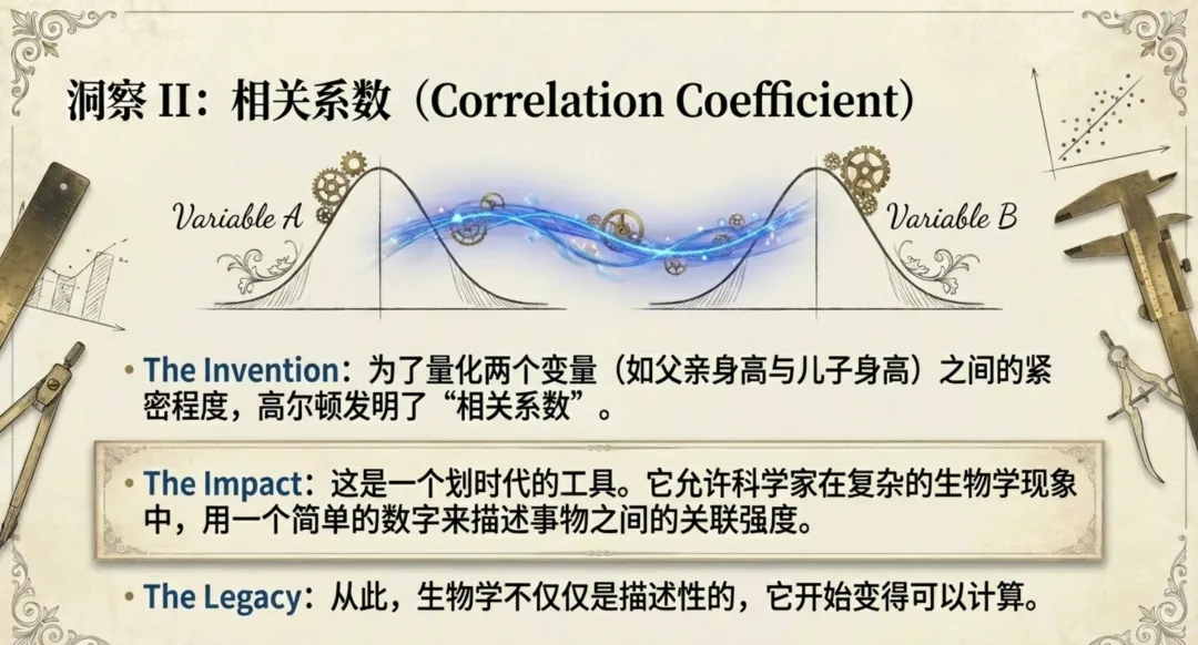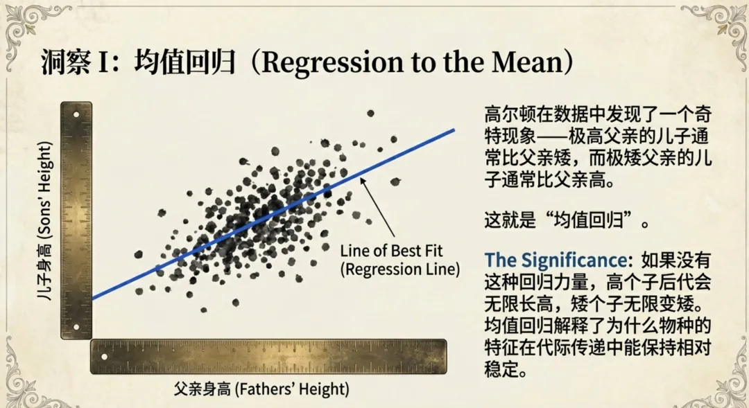 均值回归与相关性:高尔顿通过数据发现了“均值回归”现象(例如,极高父亲的儿子往往比父亲矮,极矮父亲的儿子往往比父亲高),这解释了为什么物种特征能保持稳定。他还发明了“相关系数”来量化这种关系。