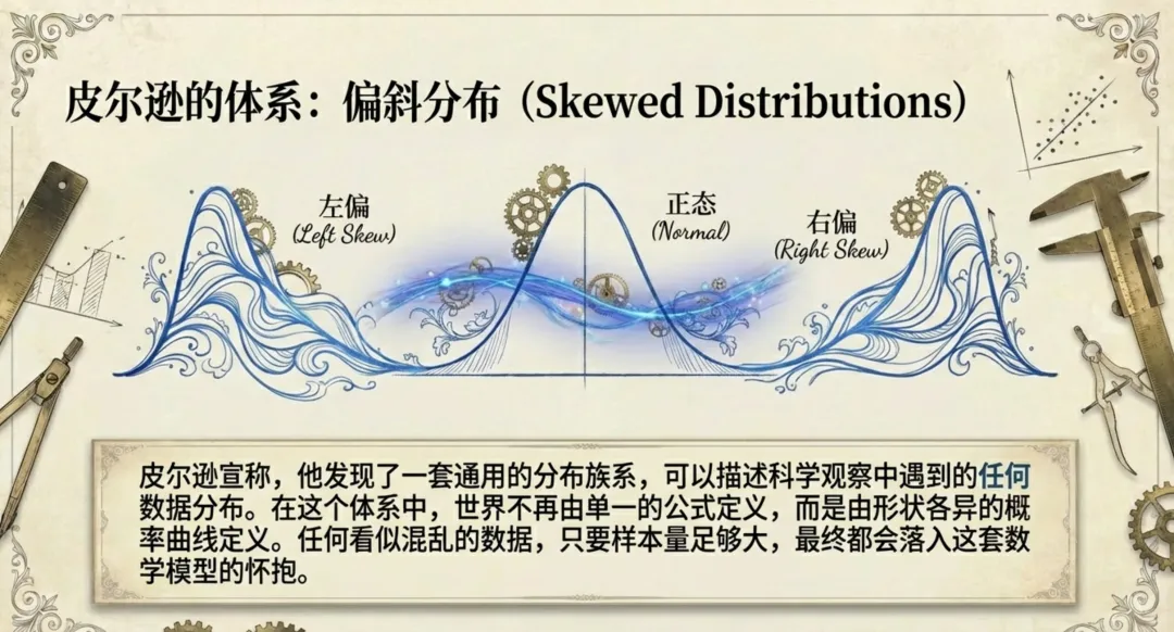 皮尔逊提出了一套**“偏斜分布”**(Skewed Distributions)的族系,宣称这套体系可以描述科学中遇到的任何数据分布。
