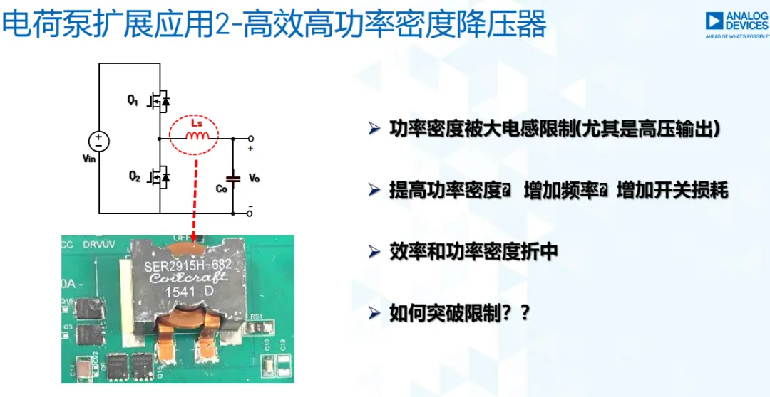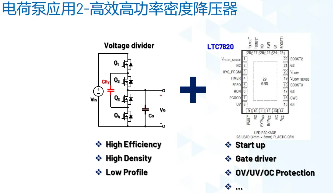 电荷泵的无电感优势的在高功率密度场景中被极致放大,以ADI LTC7820高效降压器为例,采用4开关拓扑与多飞跨电容设计,实现Vo=½Vin的降压转换,当Vin=48V、Vo=24V/20A、开关频率200kHz时,效率高达98.4%,功率密度达4000W/inch³,体积仅15mm×13mm×5mm,远超传统Buck变换器。