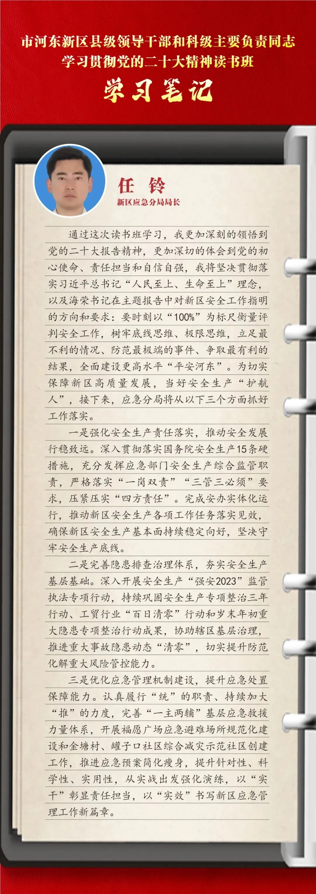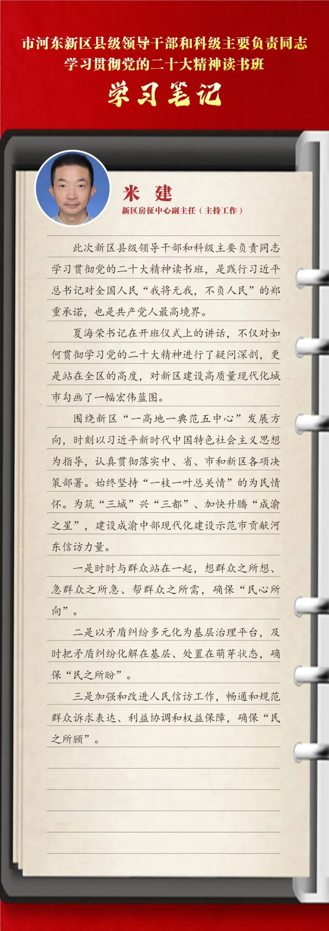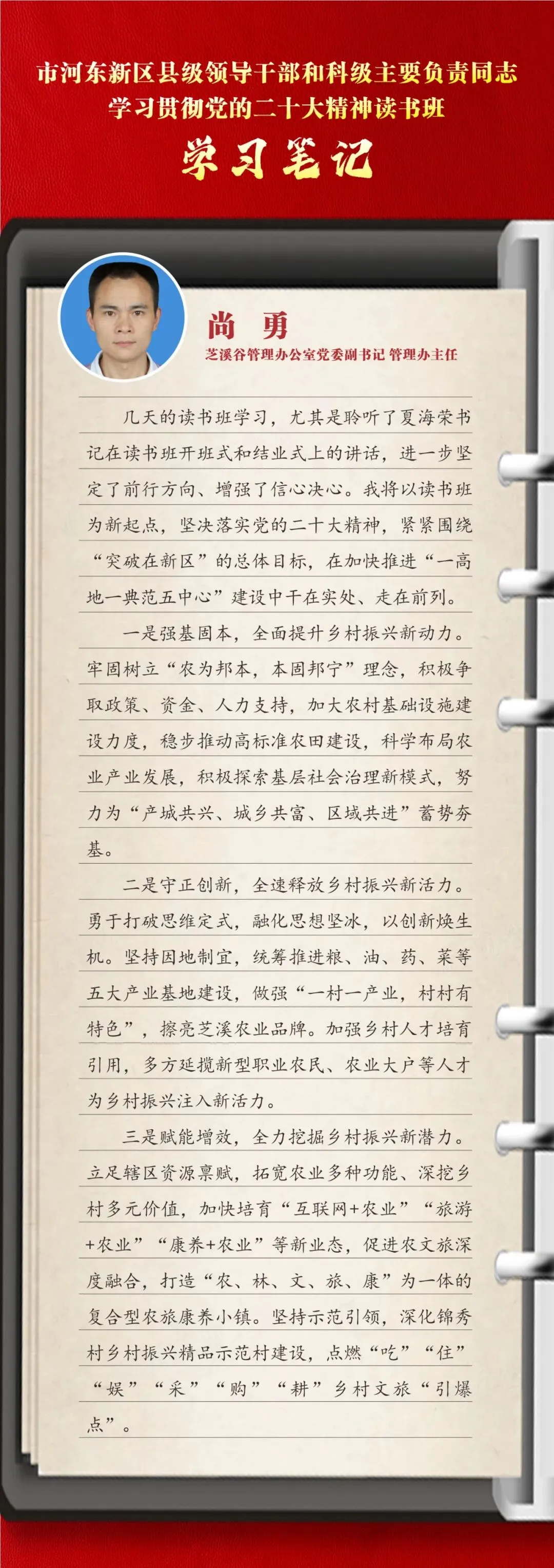 3月28日至3月30日,市河东新区县级领导干部和科级主要负责同志学习贯彻党的二十大精神读书班召开。此次读书班意义重大、内涵丰富、讲解通透。通过这次集中学习与研讨,学员们有哪些新感悟、对下一步工作有哪些新谋划?我们收集整理了部分同志的读书班笔记,在此摘登,让我们一起来看看吧!
