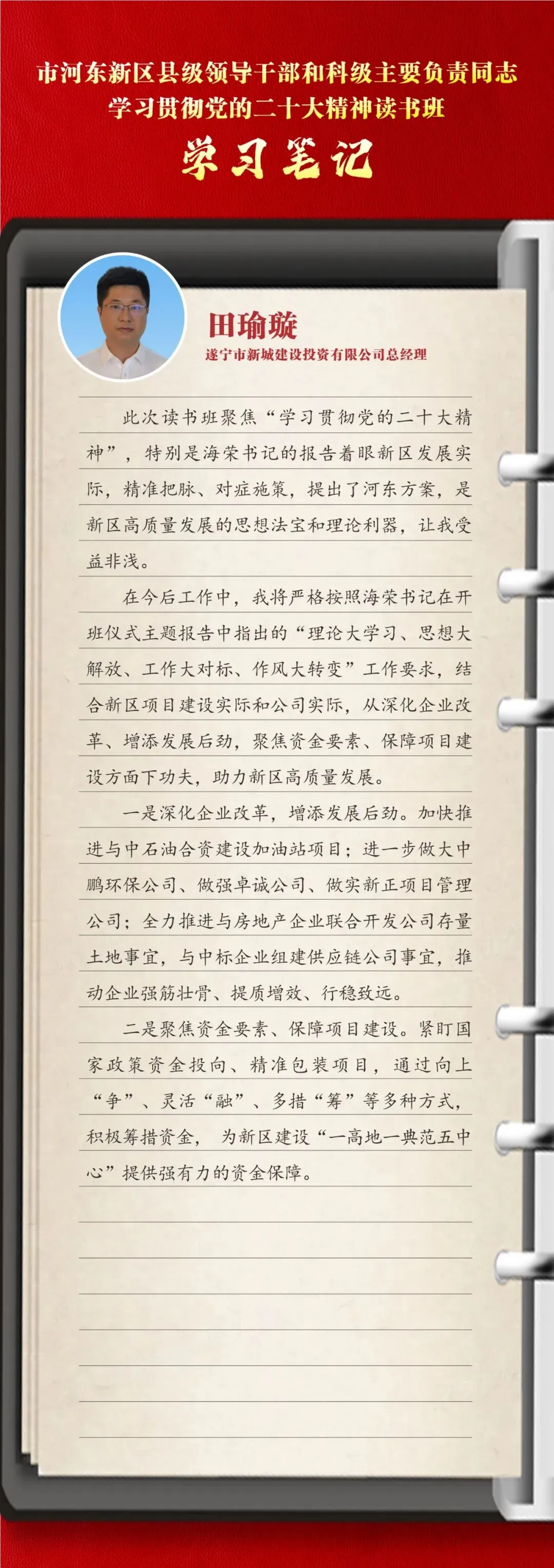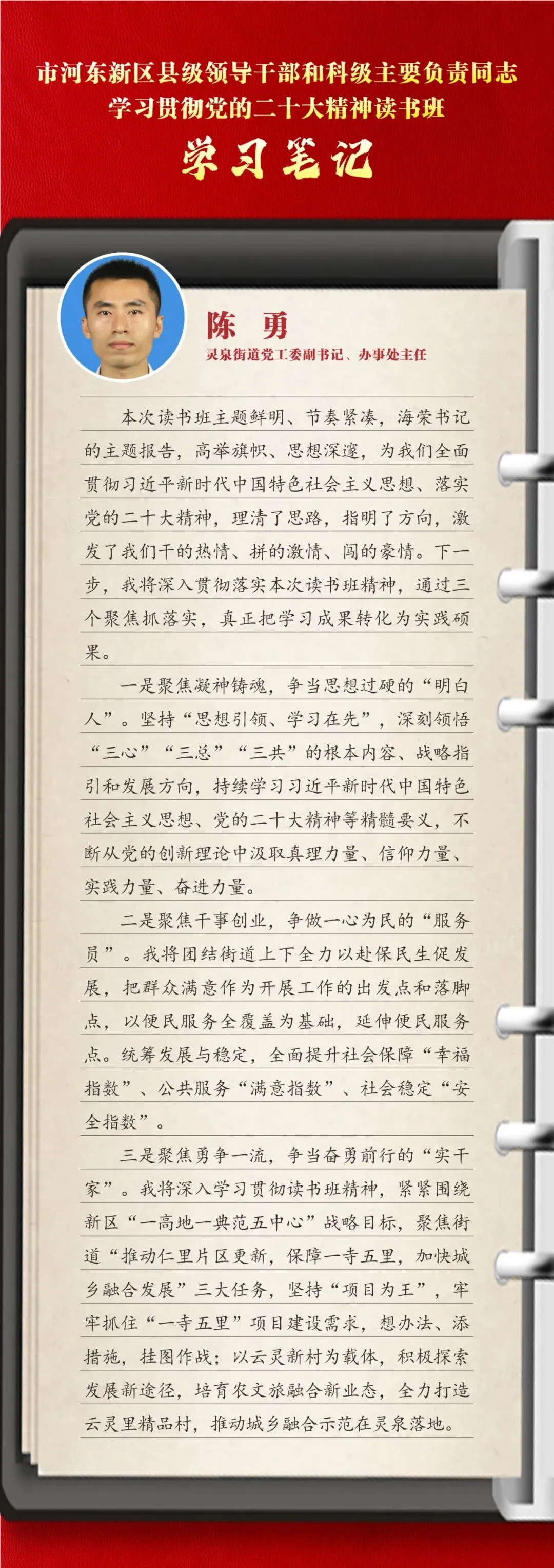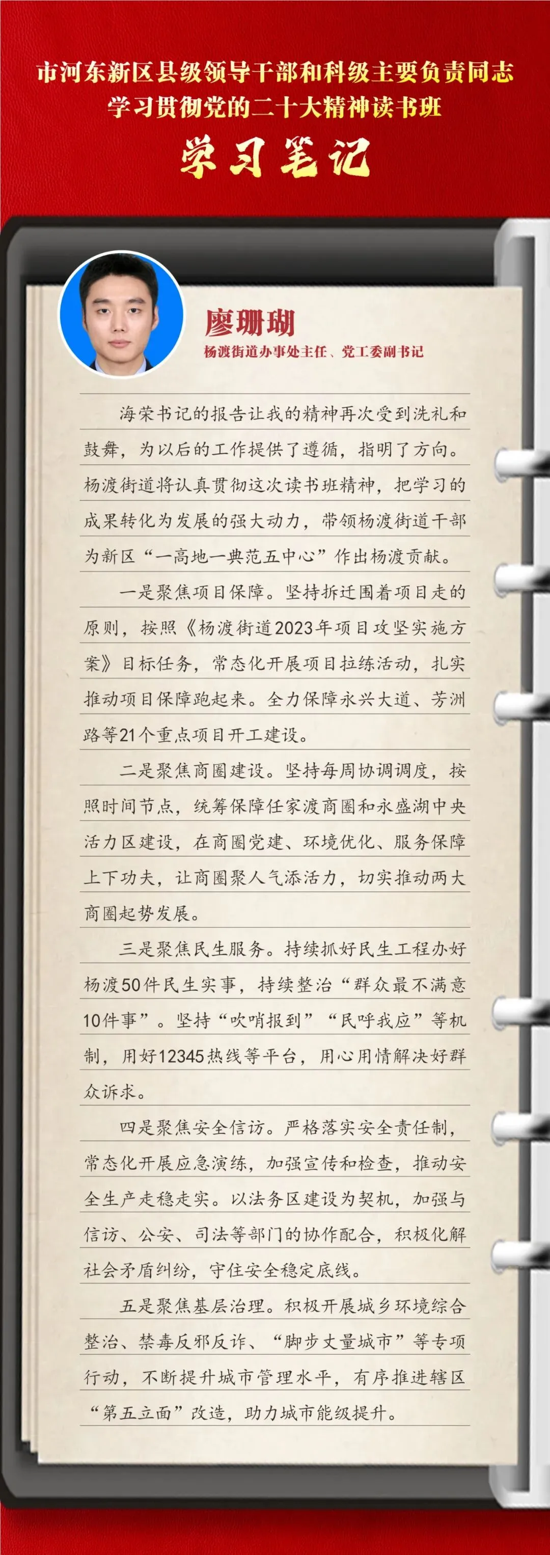 3月28日至3月30日,市河东新区县级领导干部和科级主要负责同志学习贯彻党的二十大精神读书班召开。此次读书班意义重大、内涵丰富、讲解通透。通过这次集中学习与研讨,学员们有哪些新感悟、对下一步工作有哪些新谋划?我们收集整理了部分同志的读书班笔记,在此摘登,让我们一起来看看吧!