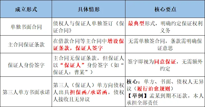 (3)三大核心性质:①单务合同:保证人仅负义务(代偿债务),债权人仅享权利(主张保证责任);②无偿合同:保证人不得向债权人请求对价(担保公司收费是向债务人收取,基于委托合同,与保证合同本身无关);③要式合同:必须以书面形式订立(无书面形式不成立)。2. 当事人主体:合同相对性——保证合同当事人是债权人与保证人,债务人并非保证合同当事人。【举例】孟某(债务人)向马某(债权人)借款,曹某(保证人)提供保证→保证合同主体是马某(债权人)与曹某(保证人),孟某不参与保证合同签订。3. 保证人资格限制(⭐️高频考点)(1)禁止作为保证人的主体(保证合同无效):①机关法人(政府、法院、检察院、居委会、村委会),原则上不得为保证人;②以公益为目的的非营利法人/非法人组织(公立学校、幼儿园、医院、养老院),依据《民法典》第683条第2款及担保制度解释第6条,其签订的保证合同无效;(2)无效后果:不产生保证责任,如存在过错,需承担缔约过失责任。4. 保证合同的成立形式(4种法定形式)
