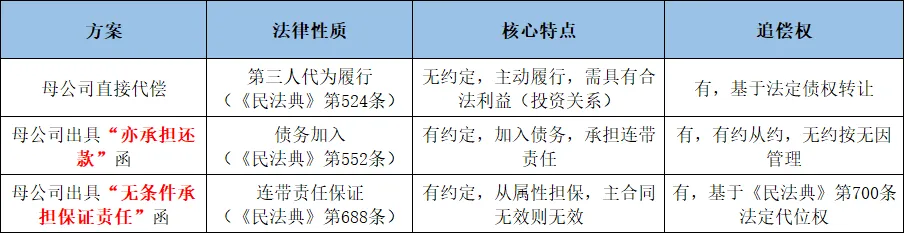 1. 保证认定标准(重点看“标的物”)(1)关键规则:未约定“特定财产担保”(如房屋、车辆、股权等物保标的),仅承诺“承担责任”→一律认定为保证。【举例】下列哪些构成保证?A. 丙在借据上签署“保证人”:丙→构成(保证人身份签字);B. 丁向乙出具字据“如甲到期不还款,本人愿还3万元”→构成(无特定财产,约定保证范围);C. 戊向乙出具字据“如甲到期不还款,由本人负责”→构成(无特定财产,概括保证);D. 己向乙出具字据“如甲到期不还款,本人以某处私房抵债”→不构成(房屋为不动产,属抵押担保);2. 母子公司债务救济的3种方案