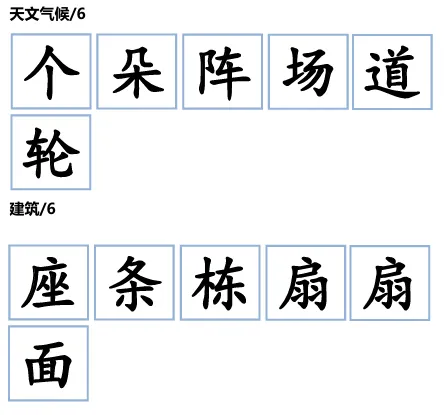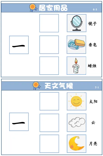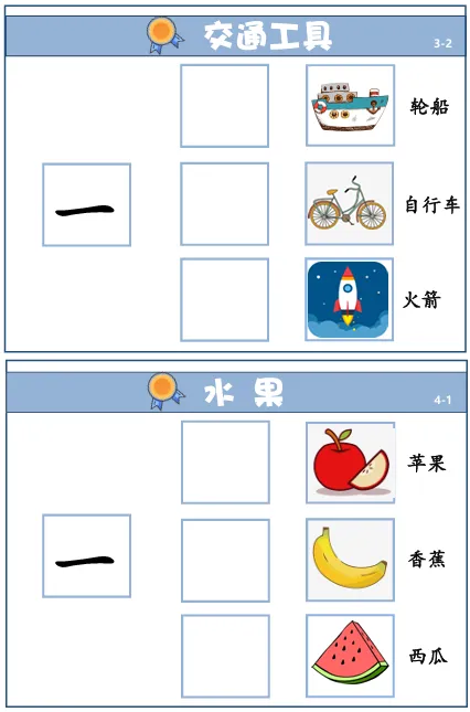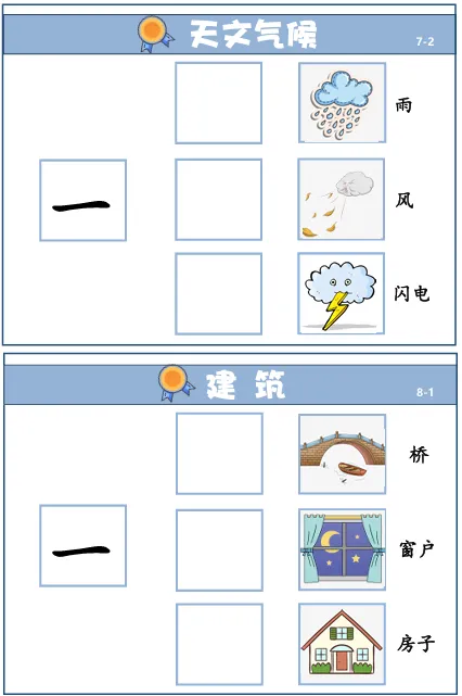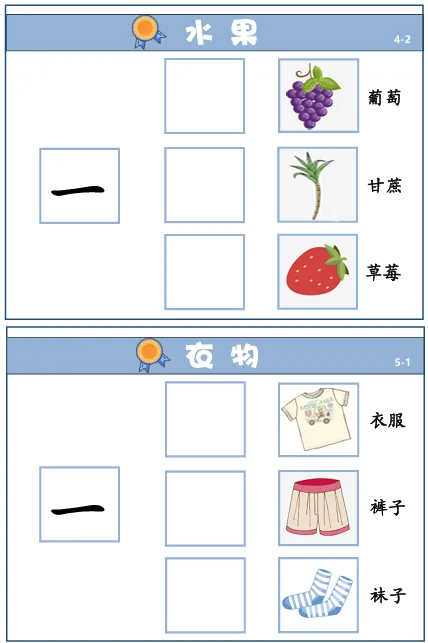 主题包括:动物、植物、交通工具、水果、衣物、居家用品、天文气候、建筑。
