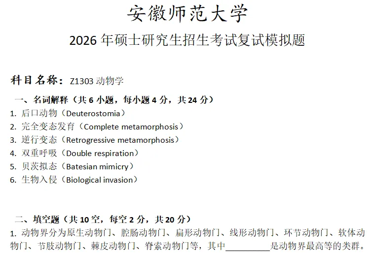 >安徽师范大学Z1303动物学考研复试真题模拟