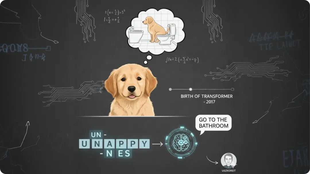 Transformer 是一种基于"自注意力机制 (Self-Attention)"的深度神经网络架构,是目前所有主流大语言模型(如 GPT-4、Claude、Gemini)的核心底层技术。与以往按顺序处理信息的模型不同,Transformer 能够并行处理整个句子的所有信息,并自动计算出哪些词对理解当前意图最重要——这是 AI 从"死记硬背"进化到"理解上下文"的转折点。如果继续用小狗的案例来比喻:Transformer 就像小狗开始真正理解我们说的话。它不仅能拆分文字,还能推断我们的真实意图并给出准确回应。比如让它去上厕所,它就知道应该去洗手间。我在 Token 机制那篇知识卡片的“总结与思考”中,回忆了乌斯科雷特如何创造 Transformer 的过程。事实上,把"unhappiness"这样的单词拆分成一个个词元,正是 Transformer 的底层逻辑,也是我们每天使用的 ChatGPT 最核心的技术之一。📜Transformer诞生的小故事
