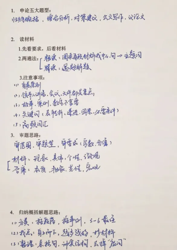 申论这部分的学习对比行测来说就会简单不少,主要就是因为申论的题型很少,而且绝大多数小题考的就是我们归纳概括材料的能力,你学会一道就相当于学会了这一类全部的题。所以,我申论的学习重点就是听视频课,跟着老师的讲课节奏进行学习,这部分也就没花很多的时间和精力。
