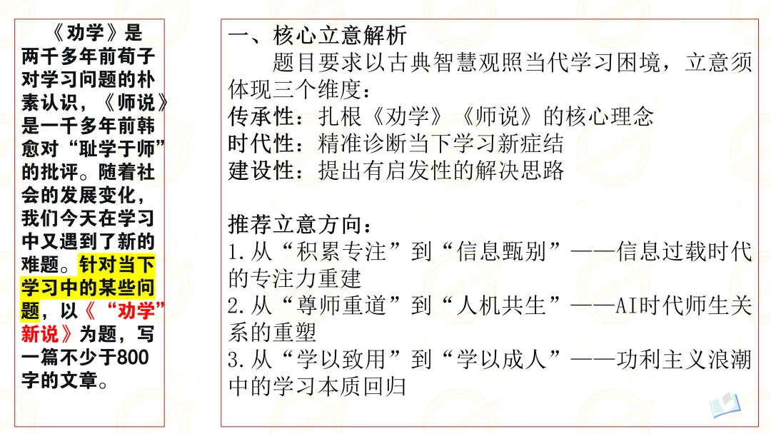 题目要求以古典智慧观照当代学习困境,立意须体现三个维度: