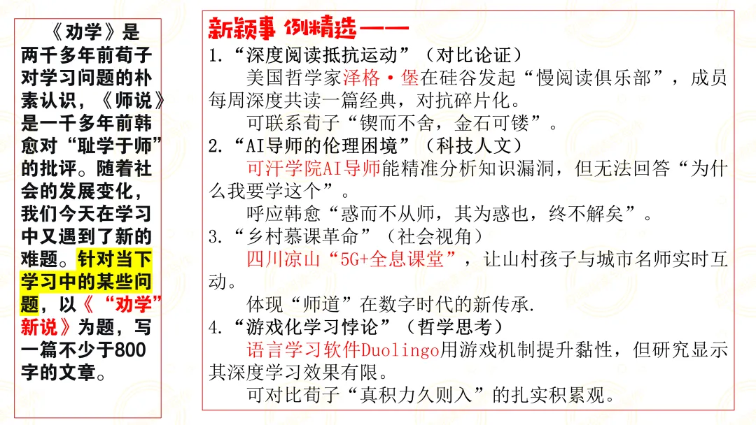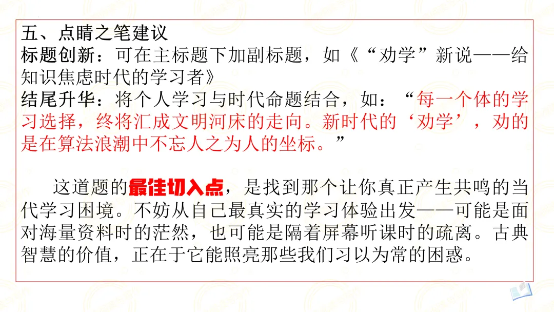 这道题的最佳切入点,是找到那个让你真正产生共鸣的当代学习困境。不妨从自己最真实的学习体验出发——可能是面对海量资料时的茫然,也可能是隔着屏幕听课时的疏离。古典智慧的价值,正在于它能照亮那些我们习以为常的困惑。 (应鸣阅读与写作原创资料,谢绝转载)