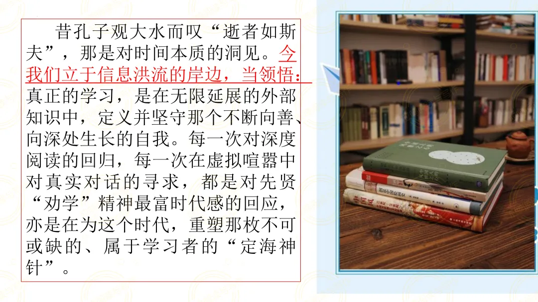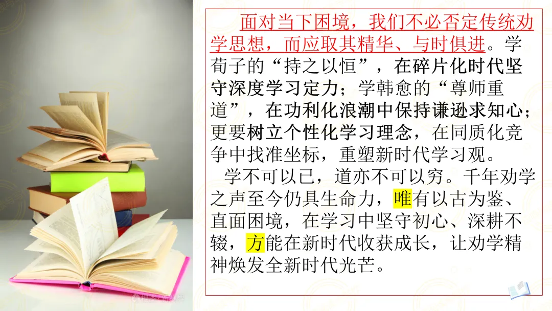 学不可以已,道亦不可以穷。千年劝学之声至今仍具生命力,唯有以古为鉴、直面困境,在学习中坚守初心、深耕不辍,方能在新时代收获成长,让劝学精神焕发全新时代光芒。(应鸣阅读与写作原创资料,谢绝转载)