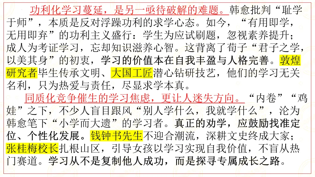 功利化学习蔓延,是另一亟待破解的难题。韩愈批判“耻学于师”,本质是反对浮躁功利的求学心态。如今,“有用即学,无用即弃”的功利主义盛行:学生为应试刷题,忽视素养提升;成人为考证学习,忘却知识滋养心智。这背离了荀子“君子之学,以美其身”的初衷,学习的价值本在自我丰盈与人格完善。敦煌研究者毕生传承文明、大国工匠潜心钻研技艺,他们的学习无关名利,只为热爱与责任,尽显求学本真。
