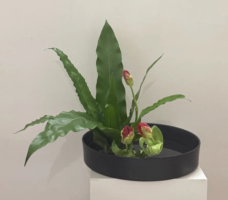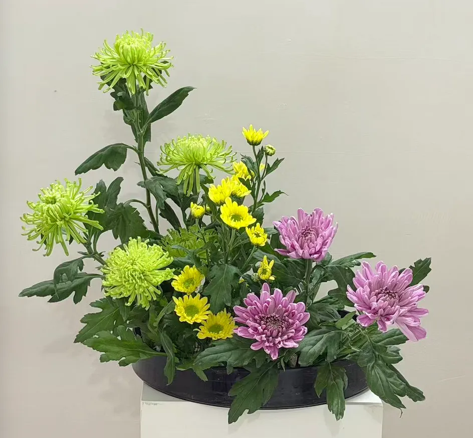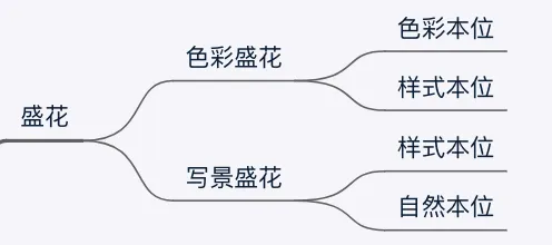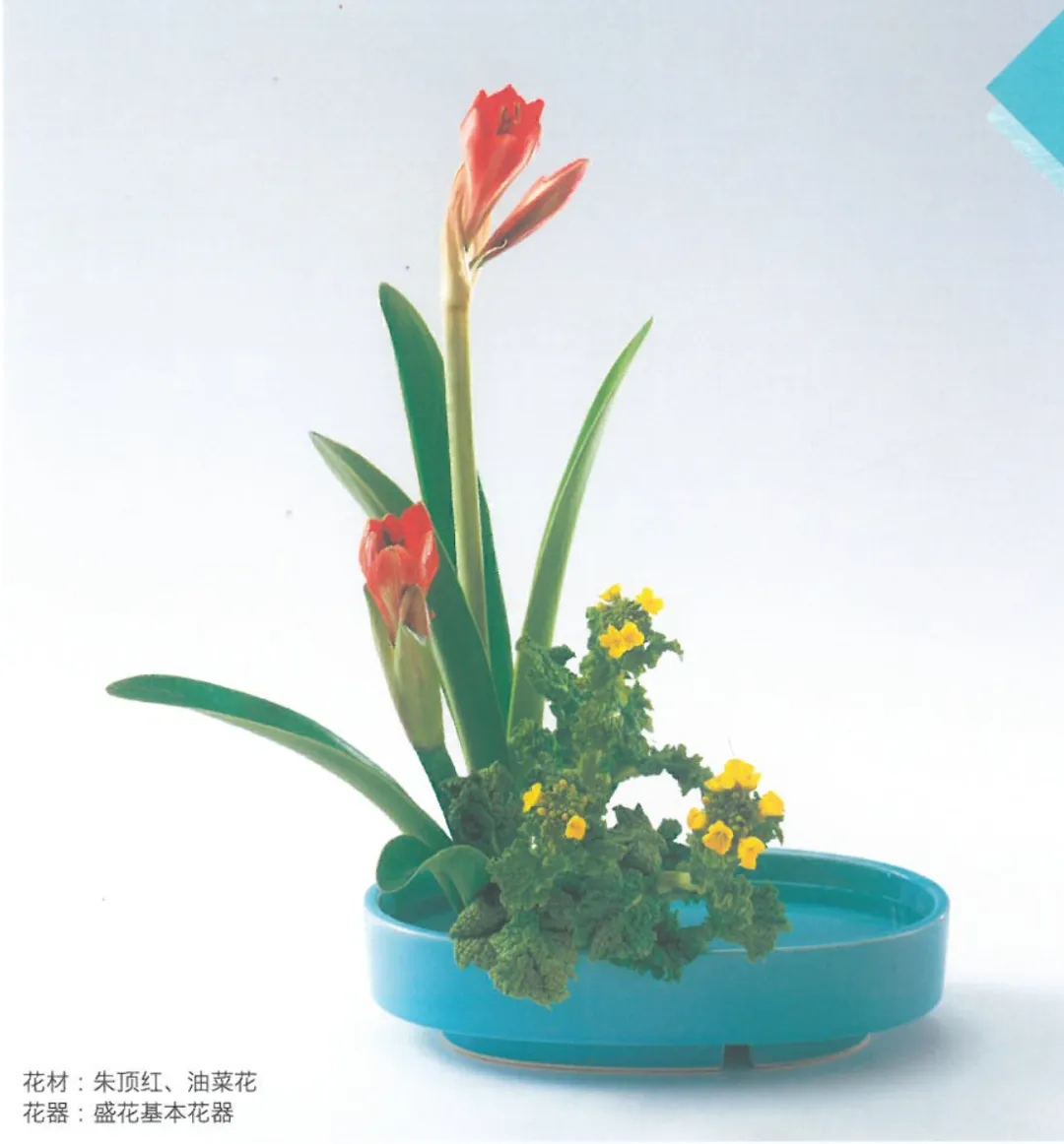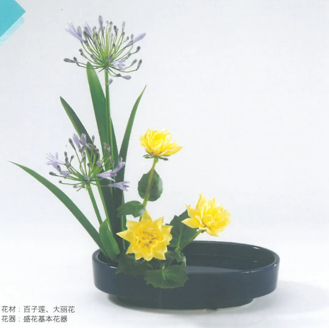 基本的花式(直立式、倾斜式、排列式、开放式)、花型(直立型、倾斜型、观水型)都已经学完了,开始进阶学习。盛花从花道表现上,可以基于上面3个花型,再分为色彩盛花和写景盛花。