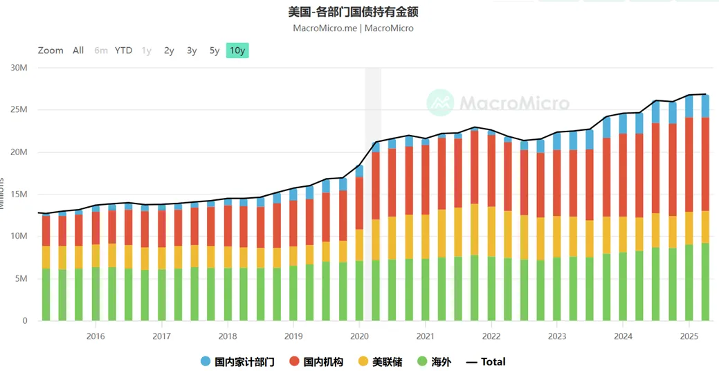 可以很清楚的看到,绿色的海外其实近10年没怎么动。包括我们国家、日本(高位波动)在内的央行,对于美债持有量在结构性减少。反而是美联储波动性的减少(这是一个潜在下场的力量),但大头增加的是红色部分,是美国的国内机构。