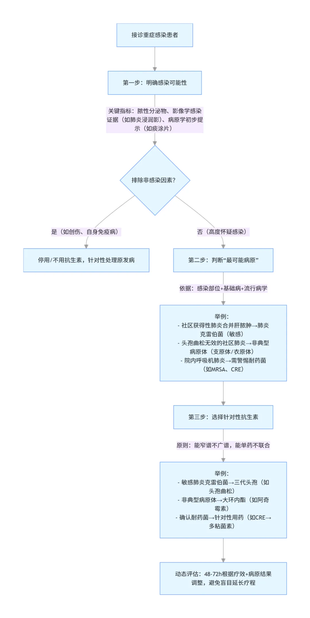 核心观点:重症感染抗生素治疗需摒弃 “全覆盖、重锤猛击” 的固定思维,聚焦 “最可能病原”,优先明确诊断而非盲目用药。