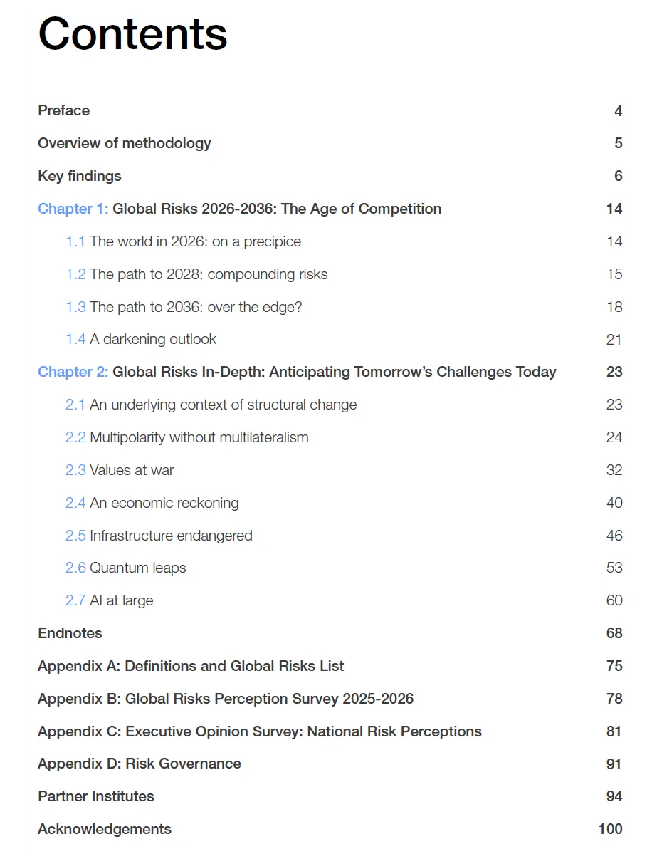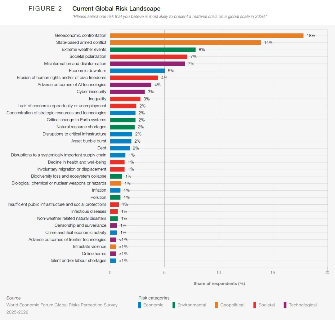 《2026年全球风险报告》告诉我们:风平浪静的日子结束了。凡事无绝对,唯有提升成事概率。芒格的智慧之所以经典,正因他道出了核心逻辑:哪怕面对最模糊的前行蓝图,只要你精准标定所有 “雷区” 并坚决绕行,你迈出的每一步,就都能更大概率踏上通向安全的坦途。先避险,再谈增长。这可能是未来十年,最朴素也最有效的生存法则。https://reports.weforum.org/docs/WEF_Global_Risks_Report_2026.pdf