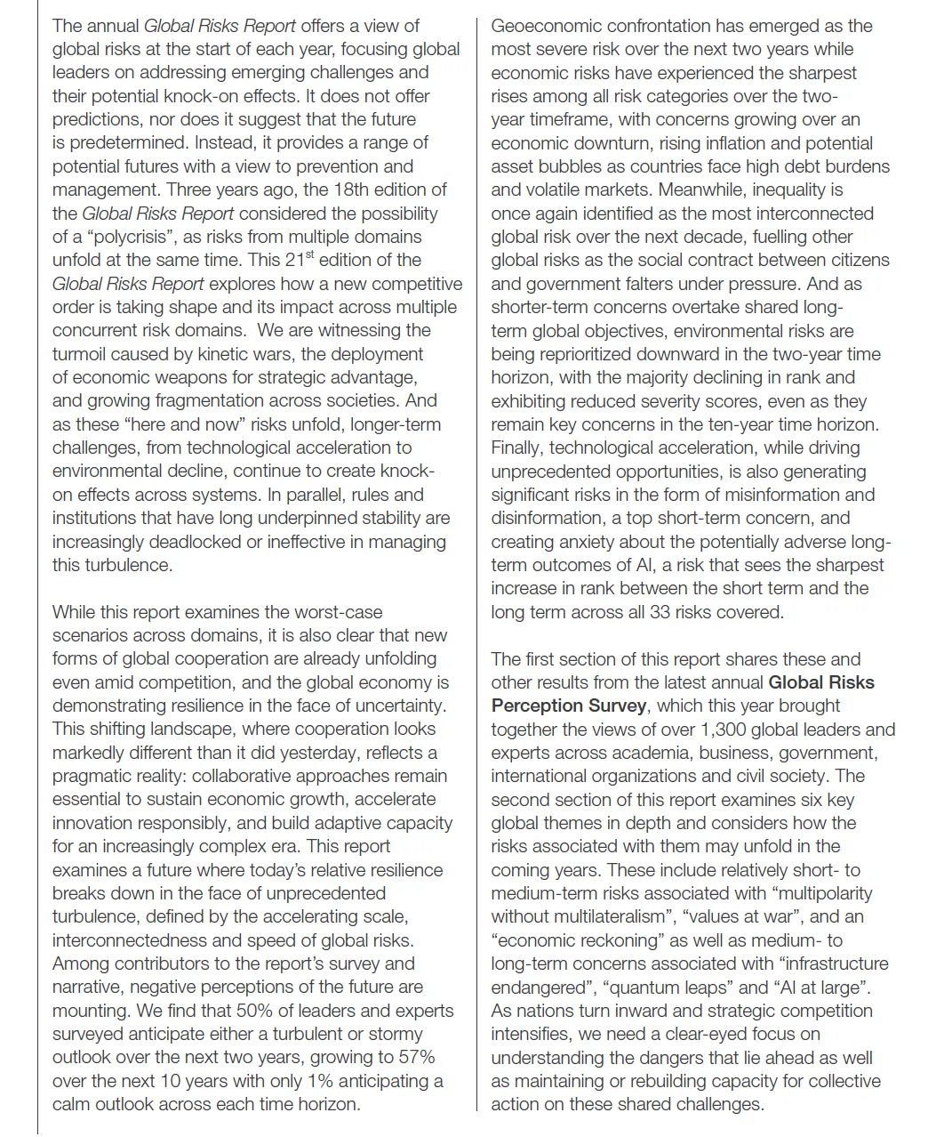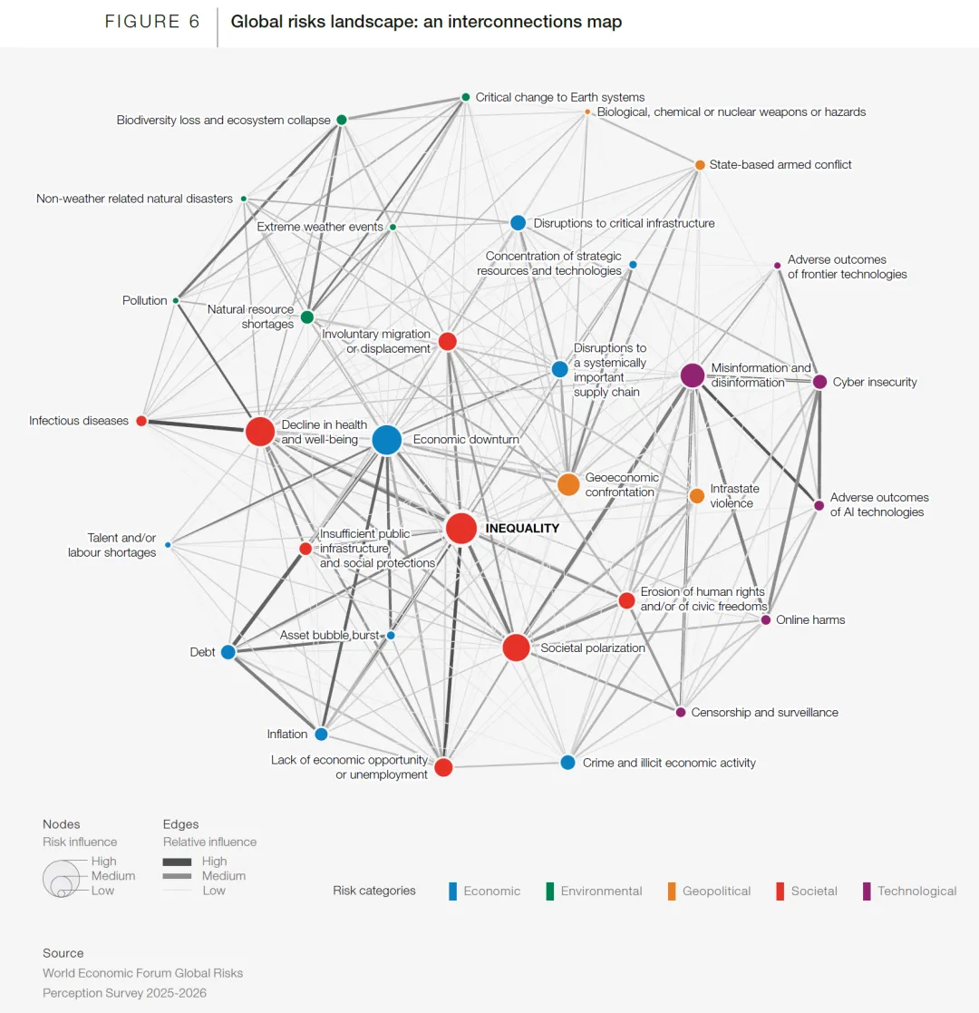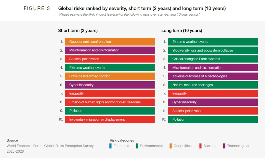 以前我们谈风险,谈的是“概率”。但读完这份报告,我发现风险的底层逻辑已经变成了“连接”(resilience)。报告开篇就定了一个调子:我们进入了“竞争时代”(The Age of Competition)。在这个时代,风险不再是单点的“黑天鹅”,而是一张“互联的网”。一个地缘政治的火花,会瞬间顺着互联网引爆舆论,顺着海缆切断供应链,顺着大气环流引发气候灾难。以前的世界像一排独立的平房,一家着火,隔壁只要防火墙够厚就没事。现在的世界像一艘连体的巨轮,底舱漏水(环境问题),会导致动力舱停摆(经济危机),最后导致驾驶室互殴(地缘冲突)。谁也逃不掉,这就是报告反复强调的“多重危机(Polycrisis)”。02. 拆解:未来风险的三大“主震带”