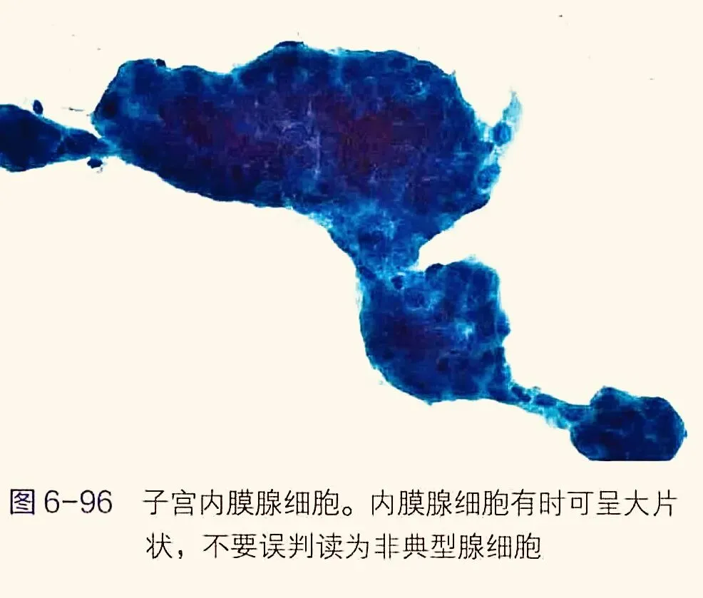 我的困惑有了答案,之前的困惑为如果是子宫内膜细胞,这么多的量,看上去似乎有乳头样或腺腔样结构,担心是不典型内膜。接着胡老师又给我发了赵澄泉主编的《宫颈癌筛查及临床处理》书上的一幅图(见下图),让我做比较: