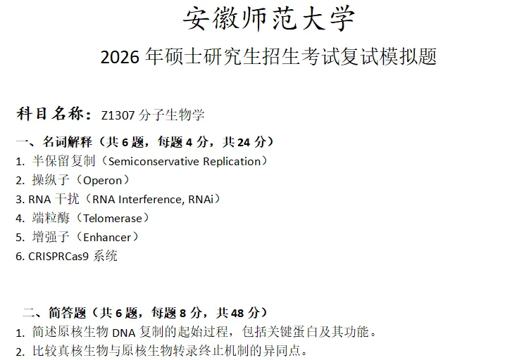 >安徽师范大学Z1307分子生物学考研复试真题模拟