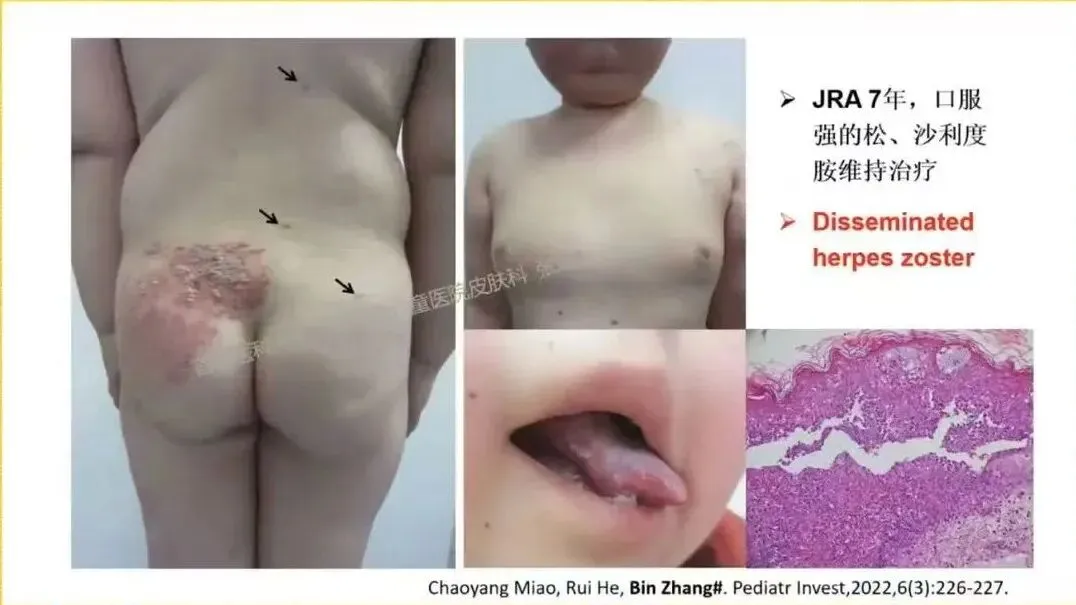 一例播散性带状疱疹患儿,因类风湿关节炎常年口服糖皮质激素治疗
