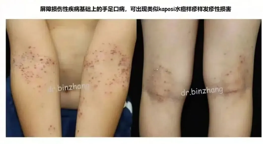 另一名手足口病患儿,在四肢关节屈侧发生了kaposi水痘痒疹