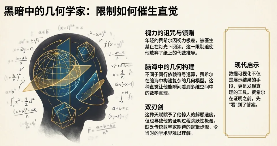 早年经历:费希尔年轻时视力极差,被禁止在灯光下看书,这迫使他在脑海中构建数学图形,培养出了极强的几何思维能力。这种直觉让他能快速解决复杂的数学问题,但也导致他的很多证明过程对其他人来说难以理解(我们认为很难理解的结论,只不过是天才觉得太简单,不屑去写公式推导过程,这在后来反而成就了较真的耶日·内曼)。