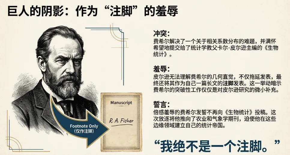 导火索:费希尔解决了一个关于相关系数分布的难题,并提交给皮尔逊的《生物统计》期刊。皮尔逊看不懂费希尔的几何证明(大家懂皮尔逊当时那种感觉吗?),拖延了很久才发表,而且将其作为自己长篇论文的一个注脚,仿佛费希尔的工作只是对他研究的补充。