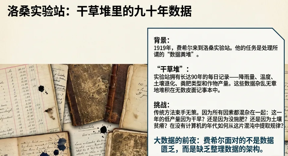 任务:洛桑实验站积累了长达90年的农业数据(降雨量、温度、施肥量、作物产量等),记录在无数皮面记事本中。费希尔的工作就是挖掘这堆“数据粪堆”中的规律。