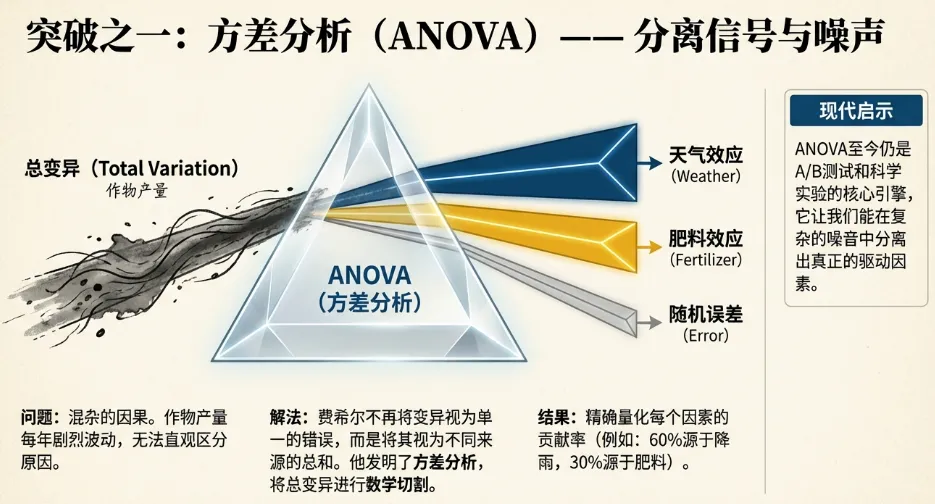 成果:通过分析这些历史数据,费希尔开发了一系列革命性的统计方法,包括方差分析(ANOVA)。他成功分离出了气候变化、土壤退化和肥料对作物产量的不同影响。