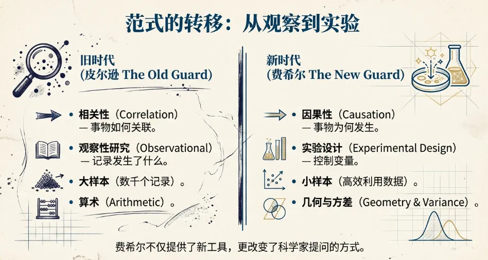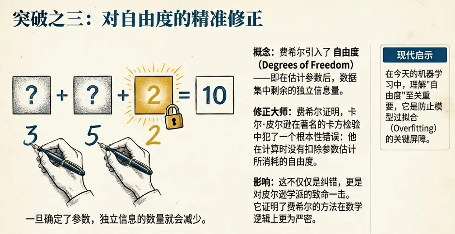 费希尔引入了**“自由度”**的概念,并指出皮尔逊在计算卡方检验时犯了一个严重错误(他在计数时没有考虑到参数估计本身消耗了自由度)。这进一步加深了新旧两代统计学巨头之间的裂痕。