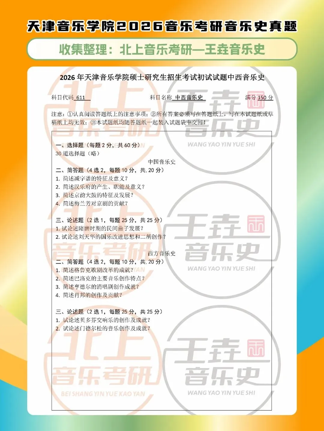 >天津音乐学院音乐史2026音乐考研音乐史真题|北上音乐考研-王垚音乐史工作室收集整理