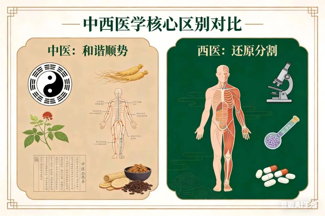 1. 西医:希波克拉底理念未落地,受物理/化学影响走“还原分割”路,把人拆成器官、细胞、物质,偏离本能核心