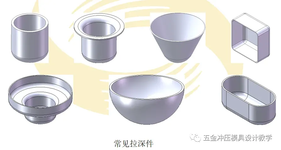 作为另一种应用广泛的变形工序,拉深工艺主要用来制造如图所示圆筒形、圆锥形、矩形、阶梯形、球面形和其他不规则形状的薄壁零件。