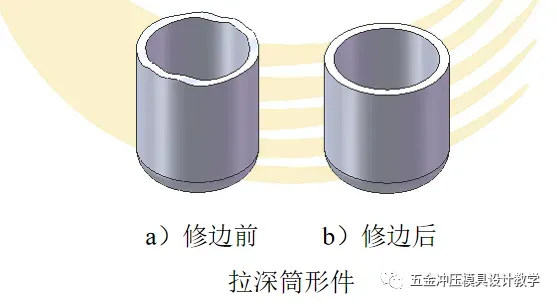 拉深时,由于金属流动条件和金属材料的各向异性,致使拉深制件口边不齐,如图所示,必须进行修边加工,以达到制件的要求。因此在计算拉深毛坯余量时,必须将修边余量计入制件。
