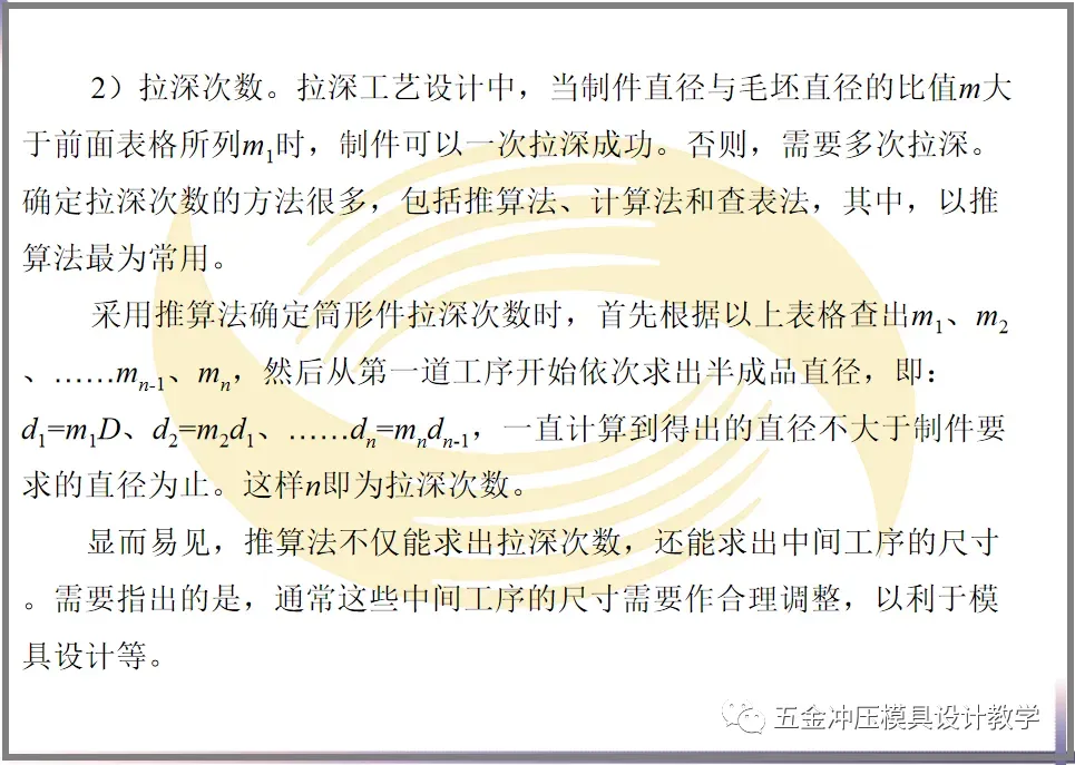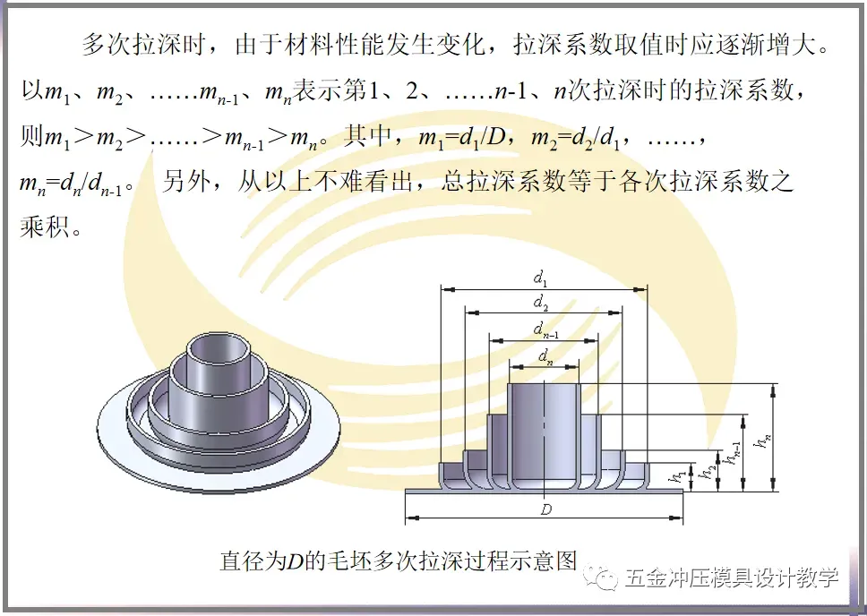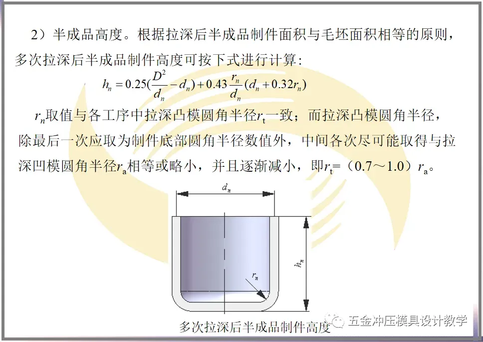 1)半成品直径。半成品直径可根据各次拉深系数算出,计算得到的最后一次拉深直径dn必须等于制件直径d。如果dn小于d,应调整各次拉深系数,最后几次的拉深系数尽量取大些,最终使dn =d。
