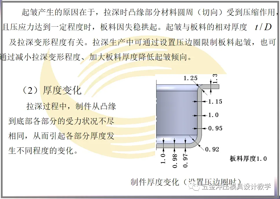 在拉深过程中,可能出现一些工艺问题,使拉深工作不能顺利进行或造成废品。这些工艺问题主要包括起皱、厚度变化及材料硬化造成的制件拉裂。