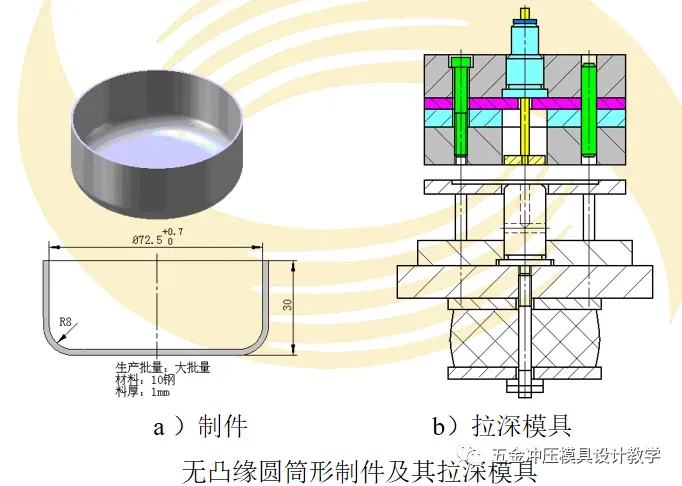 拉深模是指把制件拉压成空心体,或进一步改变空心体形状和尺寸的冲模。如图所示为无凸缘圆筒形制件及其成形用拉深模具。