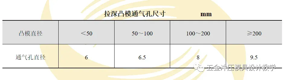 在拉深过程中,为使制件不紧贴在凸模上而难以取下或造成制件变形,在拉深凸模上应开设直径φ3mm以上的通气孔。孔的大小根据拉深凸模尺寸大小而定,具体见下表。