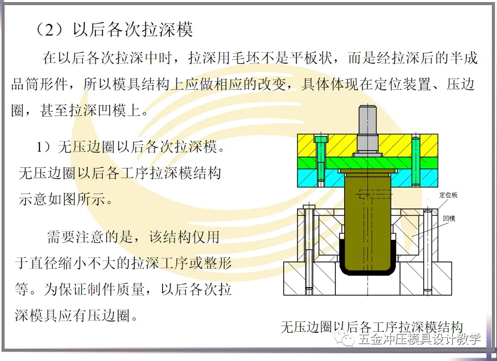 2)有压边圈的首次拉深模。工作时,凸模下降,压边圈一同下降,压边圈接触板料后,上模部分继续下行,压边圈压住板料,使板料在拉深过程中紧贴在凹模上,以防止其产生起皱现象。