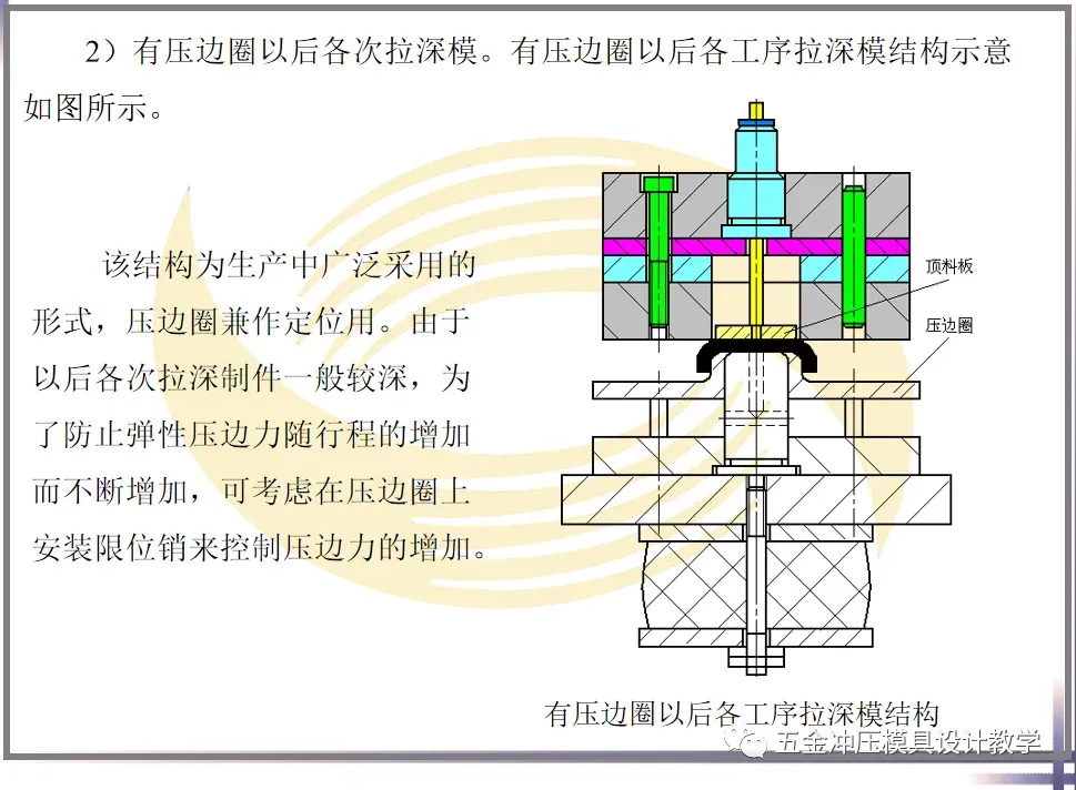 有压边圈的拉深模用于拉深材料薄、深度大,易起皱的工件。当然,压边力大小的确定很有讲究。压边力过大,制件易拉裂;压边力过小,制件会起皱。