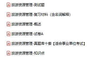 今天分享的资料是「0862-旅游资源管理」电子版+学习笔记+知识点总结+期末考试重点+复习资料+习题集及答案+名词解释+历年真题试卷及答案+题库及答案+复习重点+思考题及参考答案+公式总结+考试重点基础题+知识总结+高清PDF可打印+免费分享!