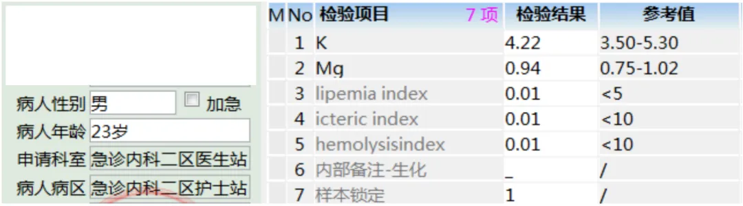 其实这个假性高血钾的原因还是很明显的,除了标本外观和血常规,最重要的就是采样时间,可能看到该样本的采样时间为1月22日下午16:24分,而实验室接收时间为1月23日08:11分,标本的上机时间为1月23日09:25分,相当于该样本从采样到真正上机时间已经过去了17个小时了,了解到该问题后,我立即电话联系了临床管床医生,但当时只有值班医生,不过还好,她刚好了解这个病人的情况,我说出我怀疑这次检测结果是假性高钾的原因,请她核对采样时间,以及采样后标本的存放情况,她也立马把当班护士叫来时行了核对,护士告知采样后样本一直存放在2-8度冰箱里。所以最后我再说出了我的理由也就是该结果可能是由于标本标本时间放置过长,且未及时处理的血液通常会离心后置于2-8°C的低温环境中冷藏导致的,请临床先不要进行降钾处理,而是重新采血进行复查,临床医生再听了我的建议后也重新开出的新的医嘱,只复查电解质,其实主要是钾,以下是重新采样的结果: