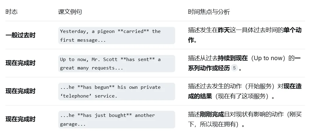 本课是前几课时态的集中应用,清晰地展示了如何根据时间焦点选择时态。