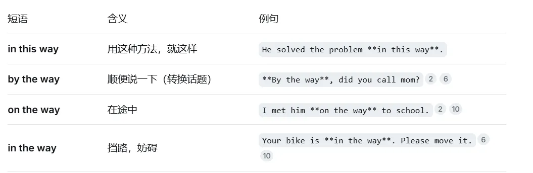 生活短语挑战:本周重点练习与 way 相关的短语。在生活中遇到相应情景时,有意识地使用: