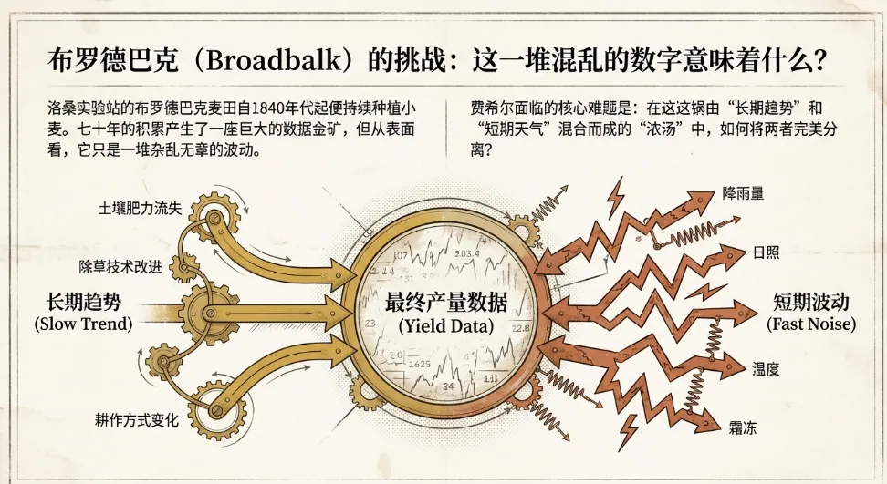 * **背景**:洛桑实验站有一块名为“布罗德巴克”的麦田,自1840年代以来一直在种植小麦。这里积累了长达几十年、看似杂乱无章的产量数据。* **挑战**:影响小麦产量的因素极其复杂,既有**长期趋势**(如土壤肥力逐渐耗尽、杂草控制技术的改进),又有**短期波动**(如每年的降雨量、日照、温度变化)。费希尔的任务是把这两类影响剥离看来,找出真正的规律。