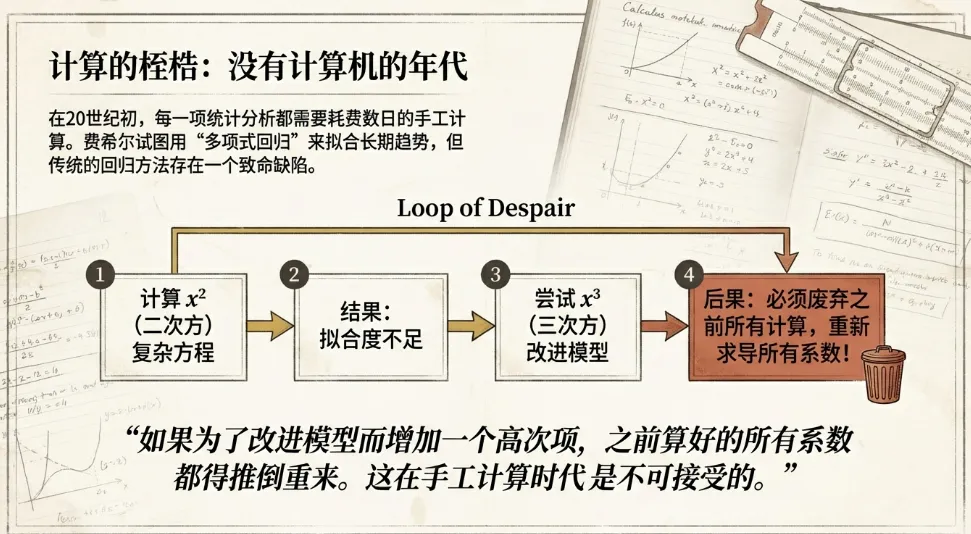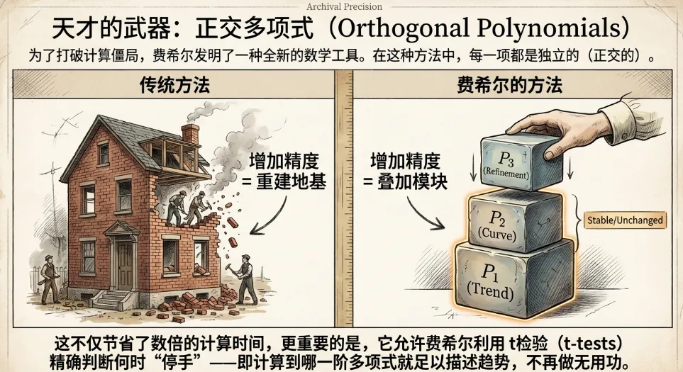 * **多项式回归**:费希尔决定用一条平滑的曲线(多项式)来拟合长期的产量趋势,而将实际产量与曲线的差异(残差)视为天气等短期因素的影响。* **计算难题**:在没有计算机的年代,通过手算拟合高阶多项式(如5次或6次方程)是极其痛苦的。而且,传统的回归方法有一个致命缺陷:如果你发现当前的曲线拟合不够好,想增加一个高次项(例如从增加到),之前算好的所有系数都得推倒重来。* **天才的解决方案**:费希尔发明了**“正交多项式”**的方法。这种方法的妙处在于,各项之间是独立的(正交的)。如果他想增加一个更高次的项来改进模型,不需要重新计算前面的项。这不仅大大简化了计算量,还让他能够通过统计检验(t检验)精确地判断到底需要多少阶的多项式才能完美描述数据的趋势。3. 解析天气的影响